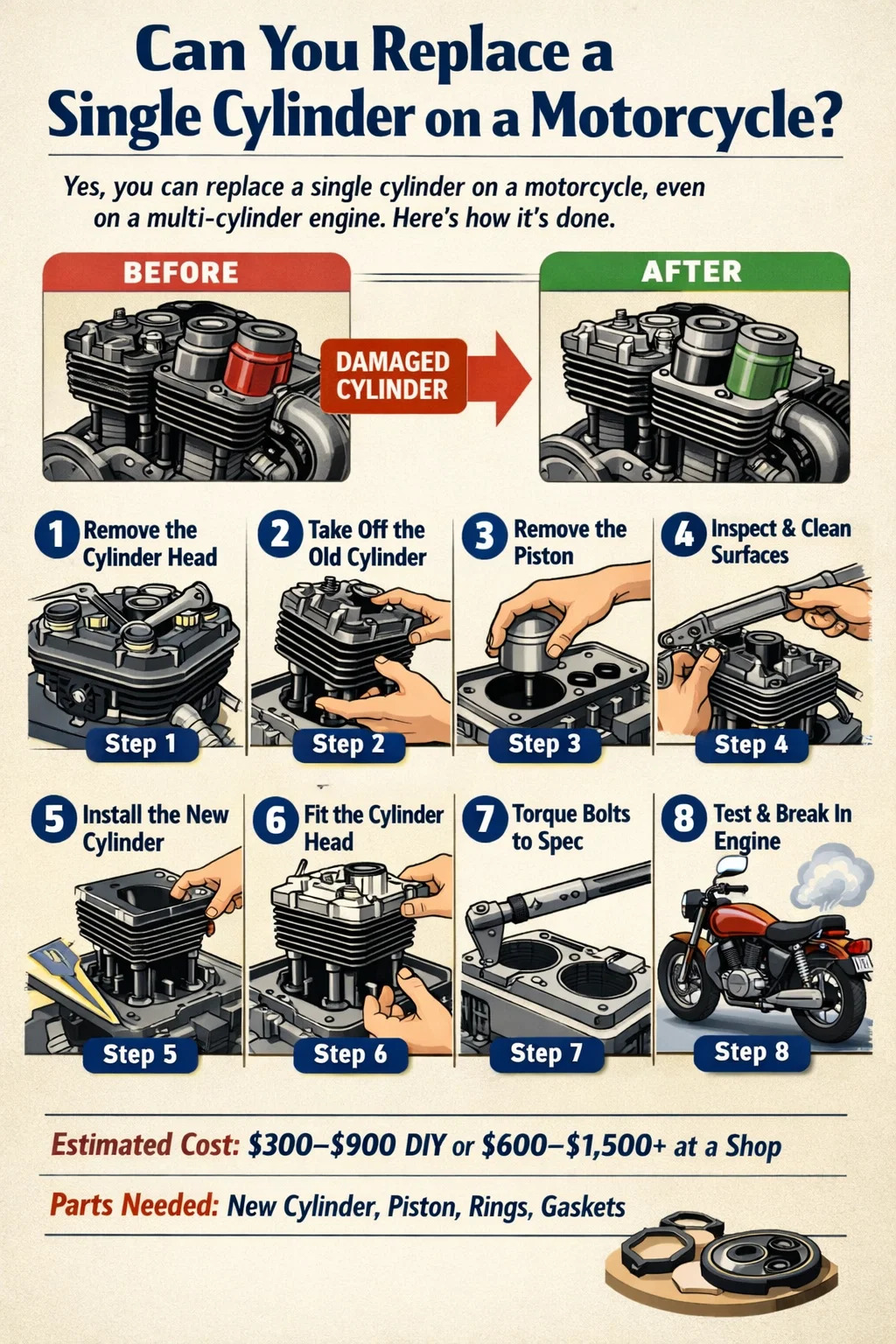 Kos berbeza-beza secara meluas berdasarkan jenis silinder, pembuatan dan model motosikal, sama ada bahagian OEM atau pasaran selepas digunakan, dan sama ada kerja itu dilakukan secara DIY atau oleh kedai. Jadual di bawah memberikan julat kos yang realistik untuk senario yang paling biasa: