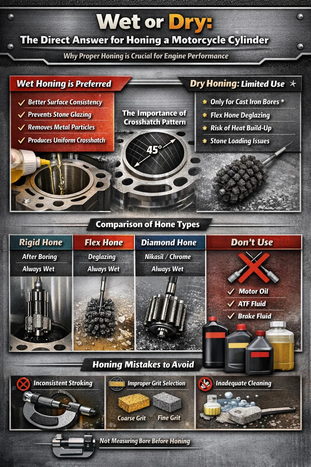 Jawapan ini penting kerana kesilapannya secara langsung menjejaskan kedudukan cincin omboh anda. Kerja mengasah yang buruk pada silinder motosikal membawa kepada penggunaan minyak, mampatan yang lemah, kehausan cincin pramatang dan enjin yang tidak pernah berfungsi seperti yang sepatutnya. Sama ada anda membina semula basikal trail 250cc silinder tunggal atau V-twin berlorek besar, memahami proses mengasah secara terperinci tidak boleh dirunding.