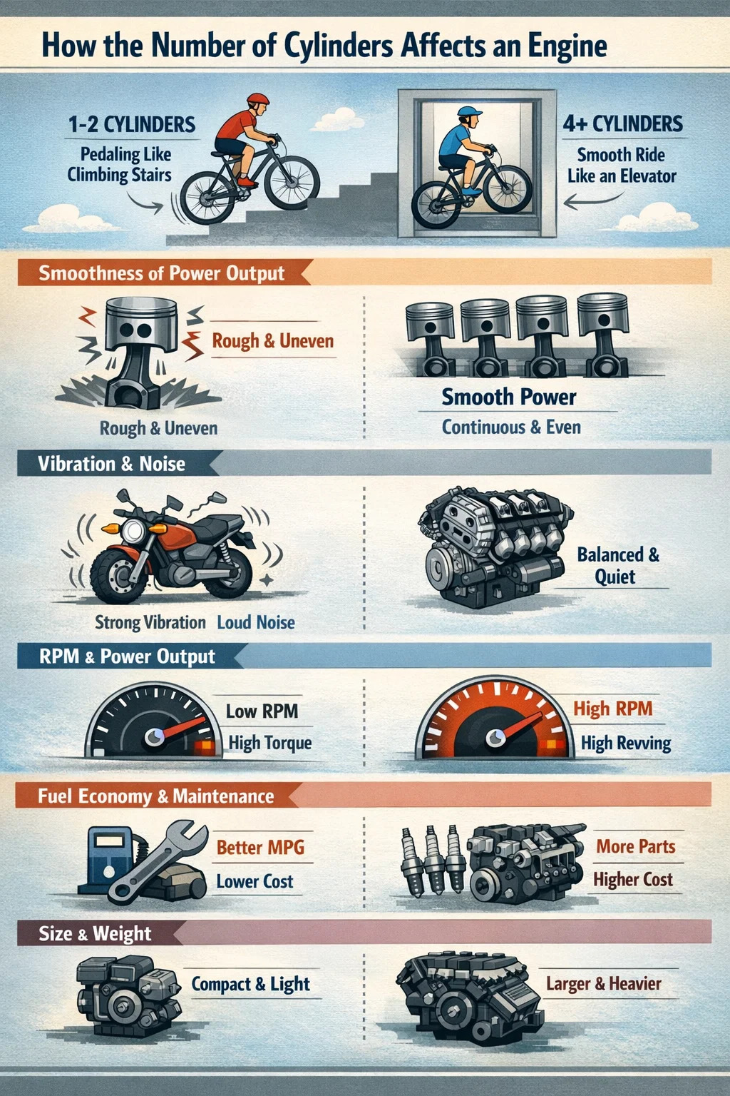 Kiraan silinder rendah (1-2 silinder): Ia seperti menaiki tangga; anda boleh merasakan "sensasi mengayuh" yang berbeza. Enjin jenis ini mempunyai kuasa yang baik pada RPM rendah, tetapi output kuasa mempunyai rasa berdenyut yang ketara dan tidak begitu berterusan.