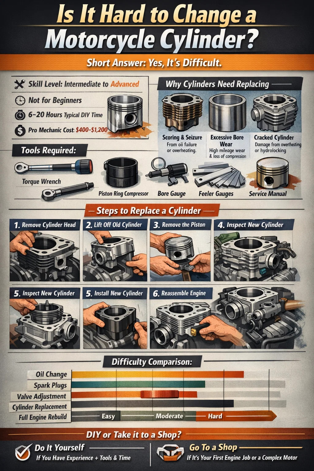 Menukar silinder motosikal adalah sederhana hingga sangat sukar bergantung pada konfigurasi enjin basikal anda, pengalaman mekanikal anda dan alatan yang anda ada. Ia bukan kerja peringkat pemula. Bagi kebanyakan penunggang tanpa pengalaman membina semula enjin, proses itu mengambil masa dari mana-mana sahaja 6 hingga 20 jam tersebar di beberapa sesi. Seorang mekanik profesional biasanya mengenakan bayaran antara $400 dan $1,200 dalam buruh sahaja, yang memberi anda rasa kerumitan yang terlibat.