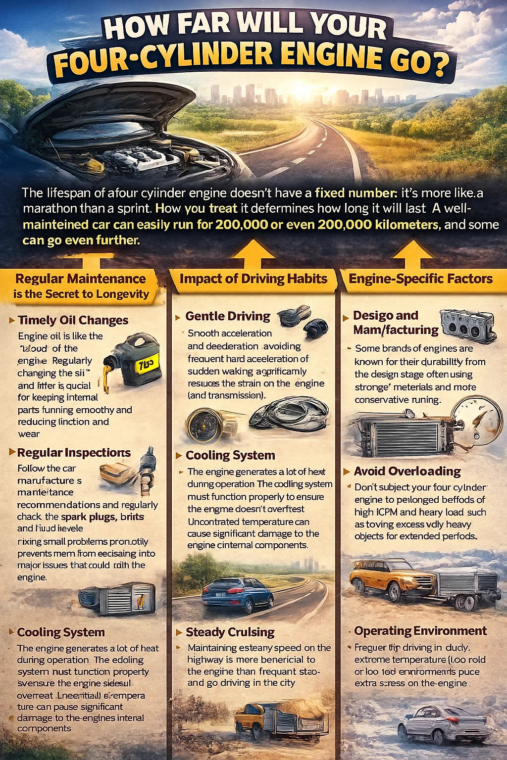 Berikut ialah faktor utama yang mempengaruhi sejauh mana enjin 4 silinder anda akan pergi: