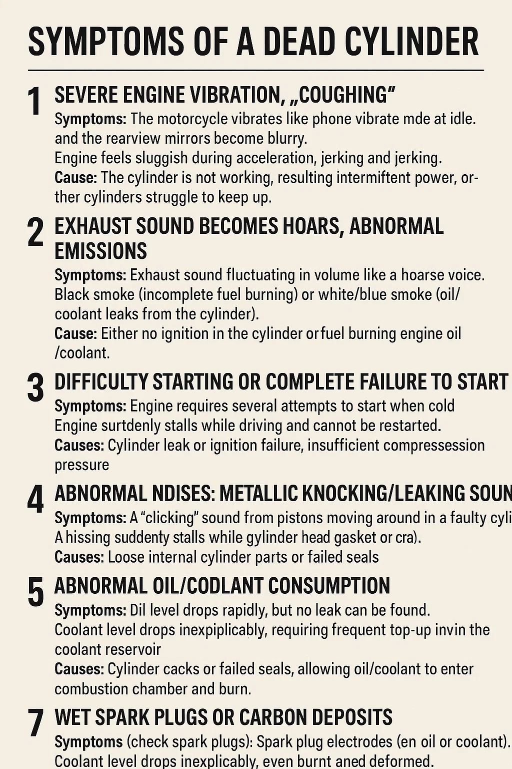 Bila a Silinder Motosikal benar -benar gagal (biasanya dikenali sebagai "silinder mati"), gejala -gejala yang jelas berikut akan muncul: