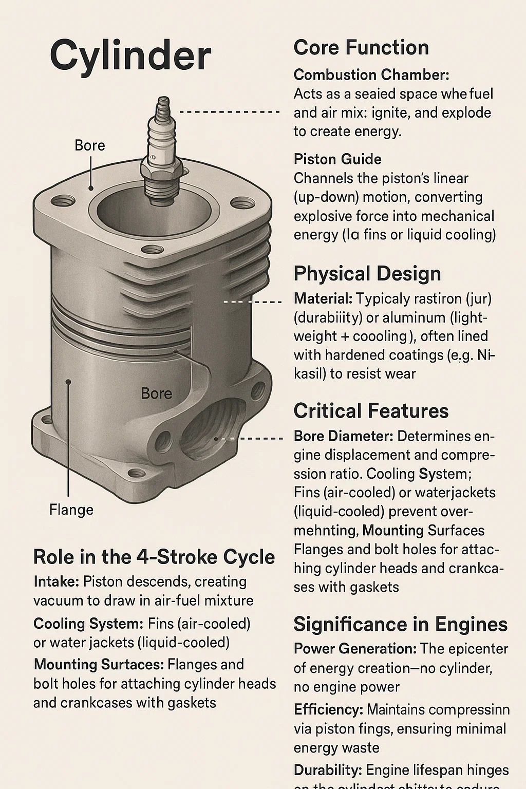 Bahan: Biasanya besi (ketahanan) atau aluminium (penyejukan ringan), sering dipenuhi dengan salutan keras (mis., Nikasil) untuk menahan haus.